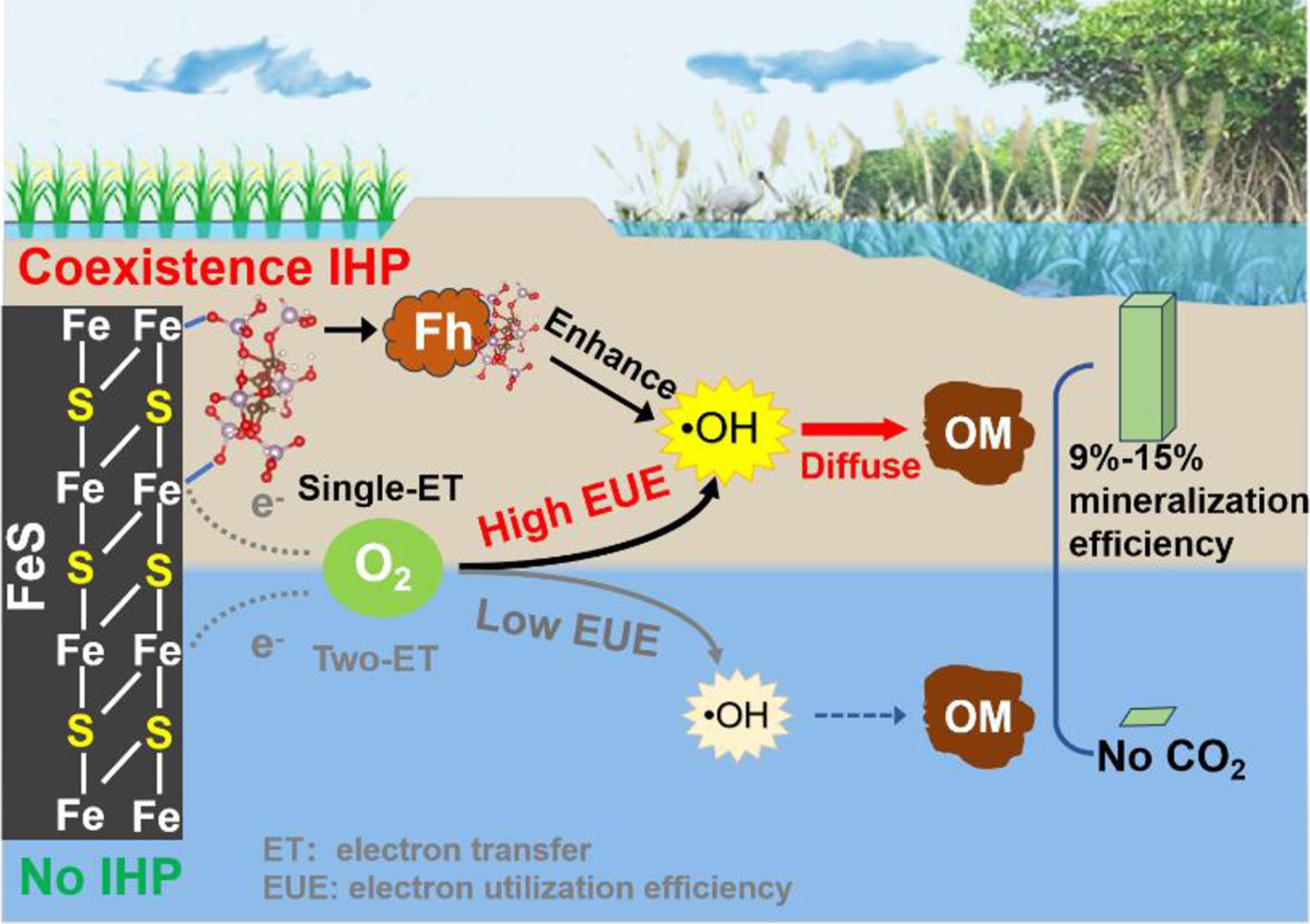 铁矿物胶体与植酸(IHP,一种土壤、水体广泛分布的有机磷化合物)之间的相互作用,显著影响稻田等湿地系统中碳元素及其耦合元素的循环。然而,IHP在缺氧-有氧界面调节Fe(II)-硫化物(FeS)氧化及羟基自由基(•OH)生成的作用仍不明确。本研究揭示了在中性pH条件下IHP显著增强FeS氧化过程中•OH的生成作用机制。密度泛函理论计算表明,相较于硫化亚铁表面的Top-S位点,IHP更倾向于与Top-Fe位点配位,形成抑制结构Fe(II)氧化的Fe(II)-IHP复合物。这使得氧还原路径从双电子途径转变为顺序单电子途径,使•OH产率提高2.0至8.9倍。光谱和电镜分析表明,IHP促进了氧化过程中纳米级水铁矿的形成,从而提高了•OH的生成。此外,IHP有助于将固相表面的•OH释放到液相中,增加其与主体成分反应的有效性。FeS氧化过程中,250 μM IHP的存在可使7.4%-41.9%的溶解有机质(DOM,1-15 mg C/L)矿化为CO2,而无IHP存在条件下则未发生矿化。该研究揭示了IHP在FeS氧化过程中提高•OH形成的作用新机制,为氧化还原频繁波动下富含IHP-FeS的稻田等湿地环境中有机碳转化动力学提供了新的见解。