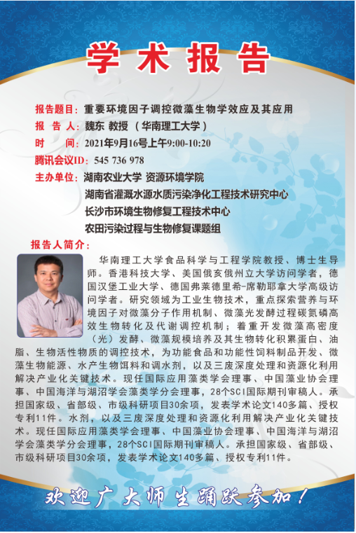 重要环境因子调控微藻生物学效应及其应用——魏东教授学术报告
